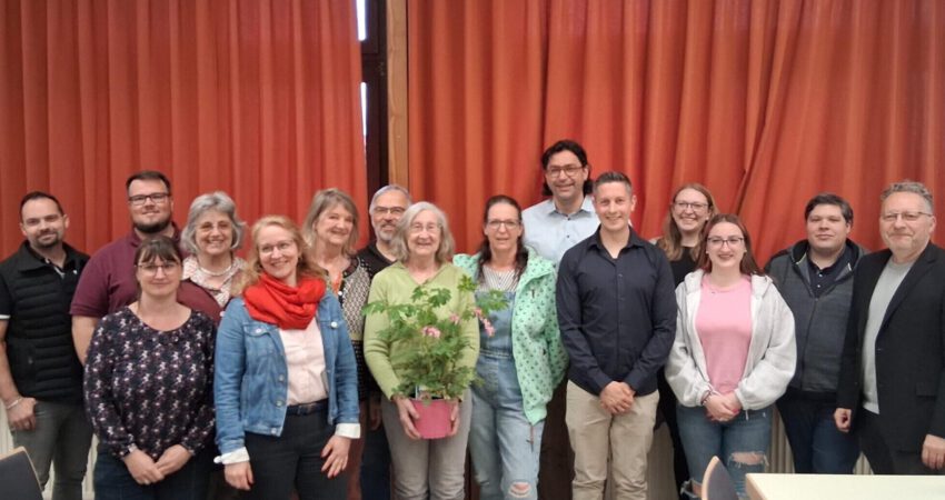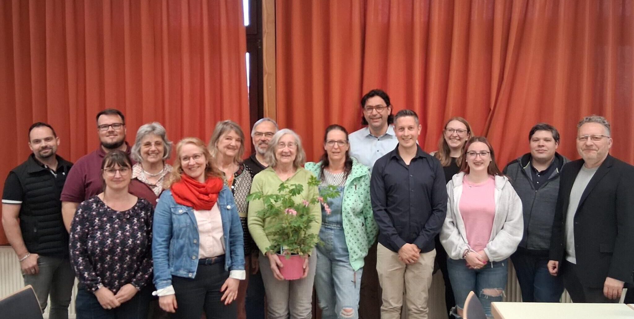 Am Montag, den 20.4.26 traf sich der neu gewählte Ortsbeirat von Bauernheim mit einigen „offiziellen“ und weiteren Gästen im Dorfgemeinschaftshaus zur konstituierenden Sitzung. Neben den Neuwahlen des Vorsitzenden, seiner Stellvertretung und der Schriftführer*innen gab es ein besonderes Ereignis: die Verabschiedung von Beate Neuwirth. Nachdem der Bürgermeister und der Ortsvorsteher das langjährige Engagement von Frau Neuwirth gewürdigt hatten, hob Uschi Knihs diese „Langstrecke“ hervor und bedankte sich bei ihr im Namen aller und besonders der Grünen mit einem Topf „Tränende Herzen“.