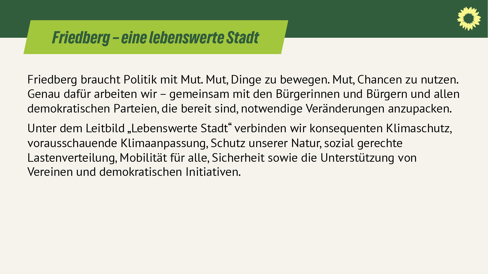 Unter dem Leitbild „Lebenswerte Stadt“ verbinden wir konsequenten Klimaschutz, vorausschauende Klimaanpassung, Schutz unserer Natur, sozial gerechte Lastenverteilung, Mobilität für alle, Sicherheit sowie die Unterstützung von Vereinen und demokratischen Initiativen.