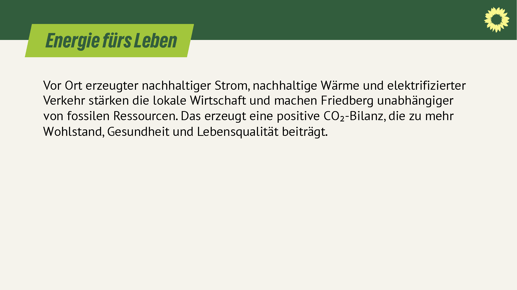 Vor Ort erzeugter nachhaltiger Strom, nachhaltige Wärme und elektrifizierter Verkehr stärken die lokale Wirtschaft und machen Friedberg unabhängiger von fossilen Ressourcen. Das erzeugt eine positive CO₂-Bilanz, die zu mehr Wohlstand, Gesundheit und Lebensqualität beiträgt.