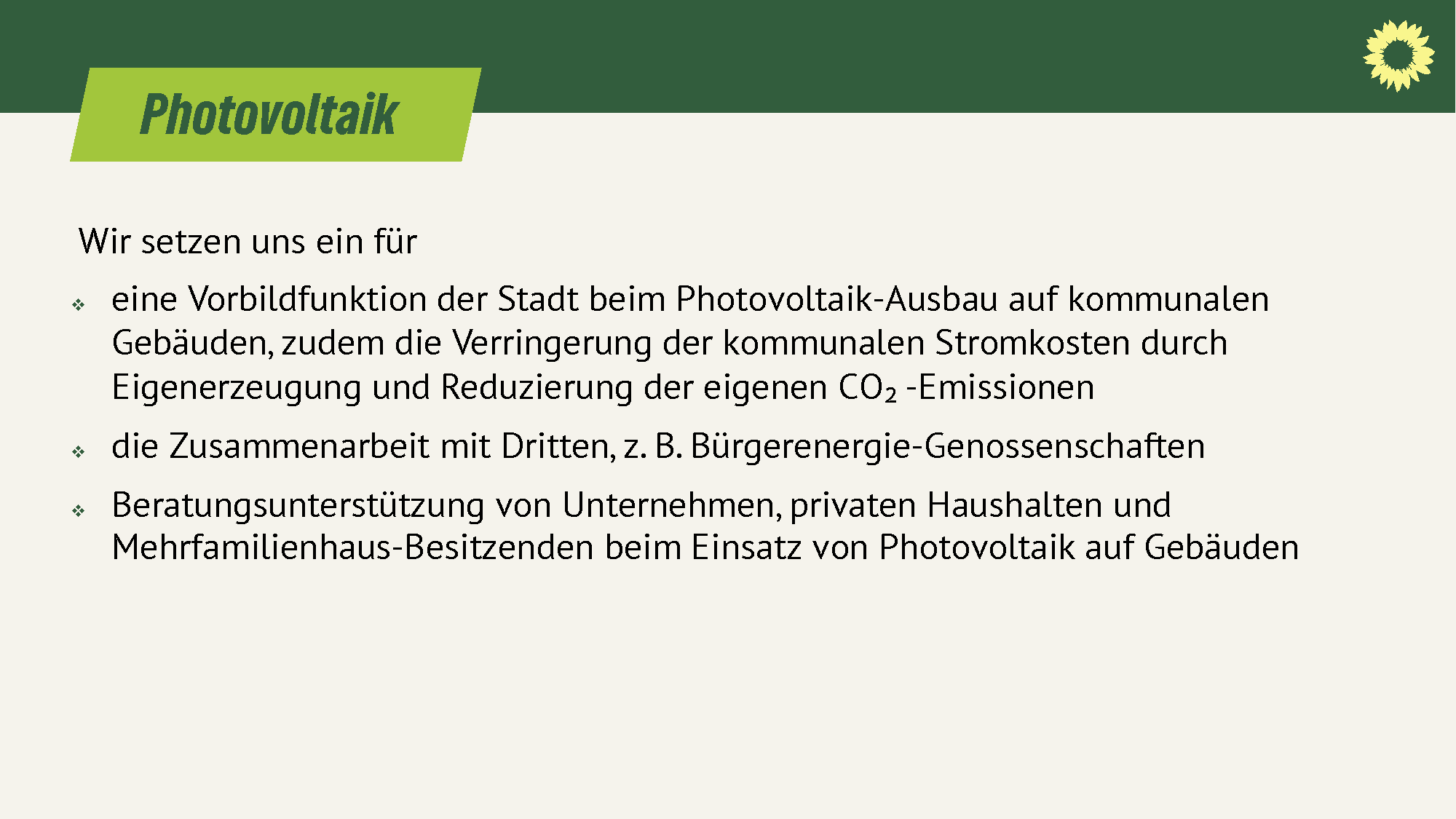 - eine Vorbildfunktion der Stadt beim Photovoltaik-Ausbau auf kommunalen Gebäuden, für die Verringerung der kommunalen Stromkosten durch Eigenerzeugung und Reduzierung der eigenen CO2-Emissionen