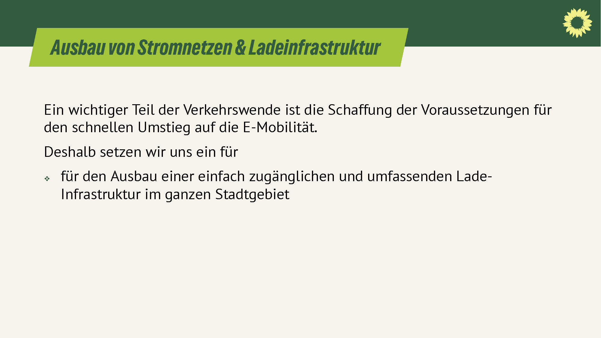 - für den Ausbau einer einfach zugänglichen und umfassenden Lade-Infrastruktur im ganzen Stadtgebiet