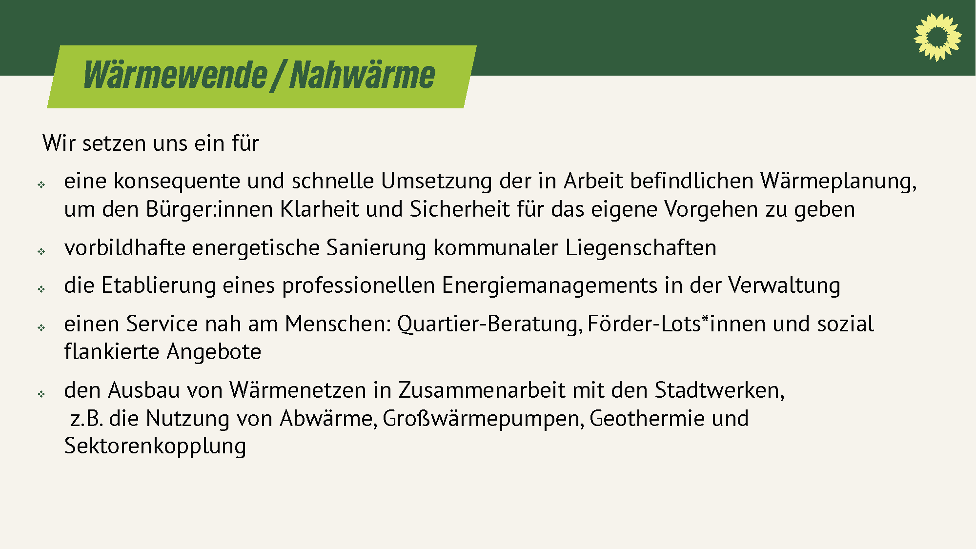 - eine konsequente und schnelle Umsetzung der in Arbeit befindlichen Wärmeplanung, um den Bürger:innen Klarheit und Sicherheit für das eigene Vorgehen zu geben