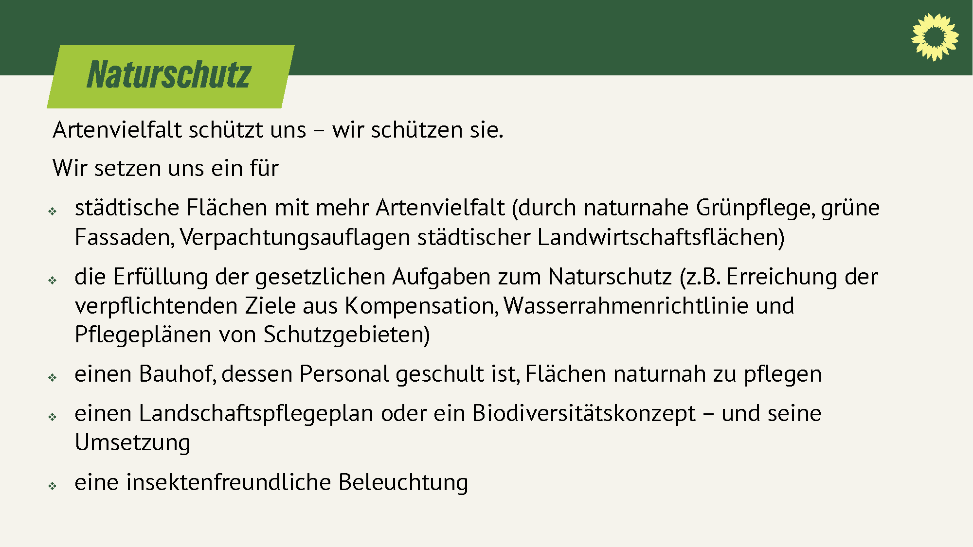 - städtische Flächen mit mehr Artenvielfalt (durch naturnahe Grünpflege, grüne Fassaden, Verpachtungsauflagen städtischer Landwirtschaftsflächen)
