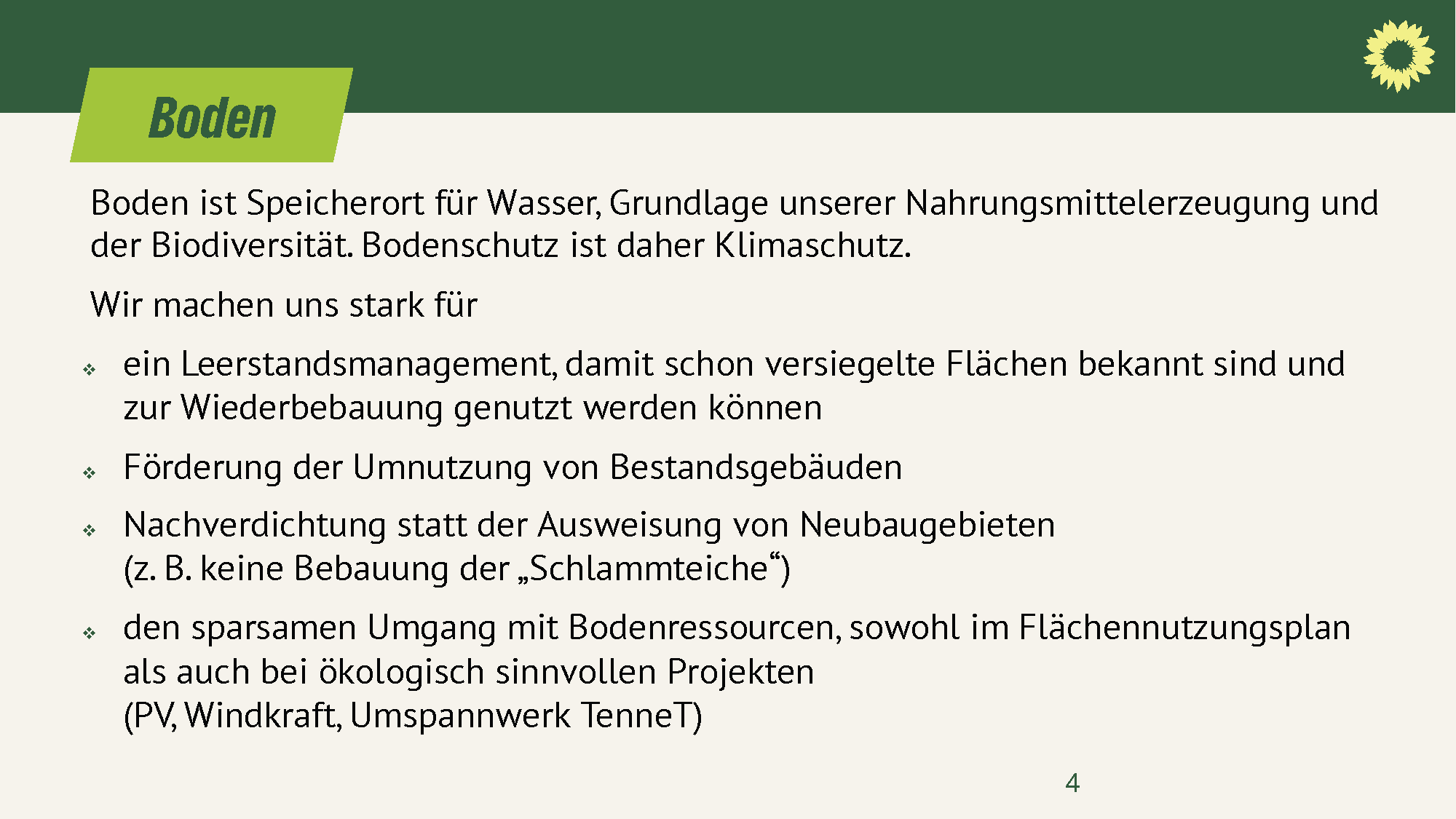 - den sparsamen Umgang mit Bodenressourcen, sowohl im Flächennutzungsplan als auch bei ökologisch sinnvollen Projekten (PV, Windkraft, Umspannwerk TenneT)