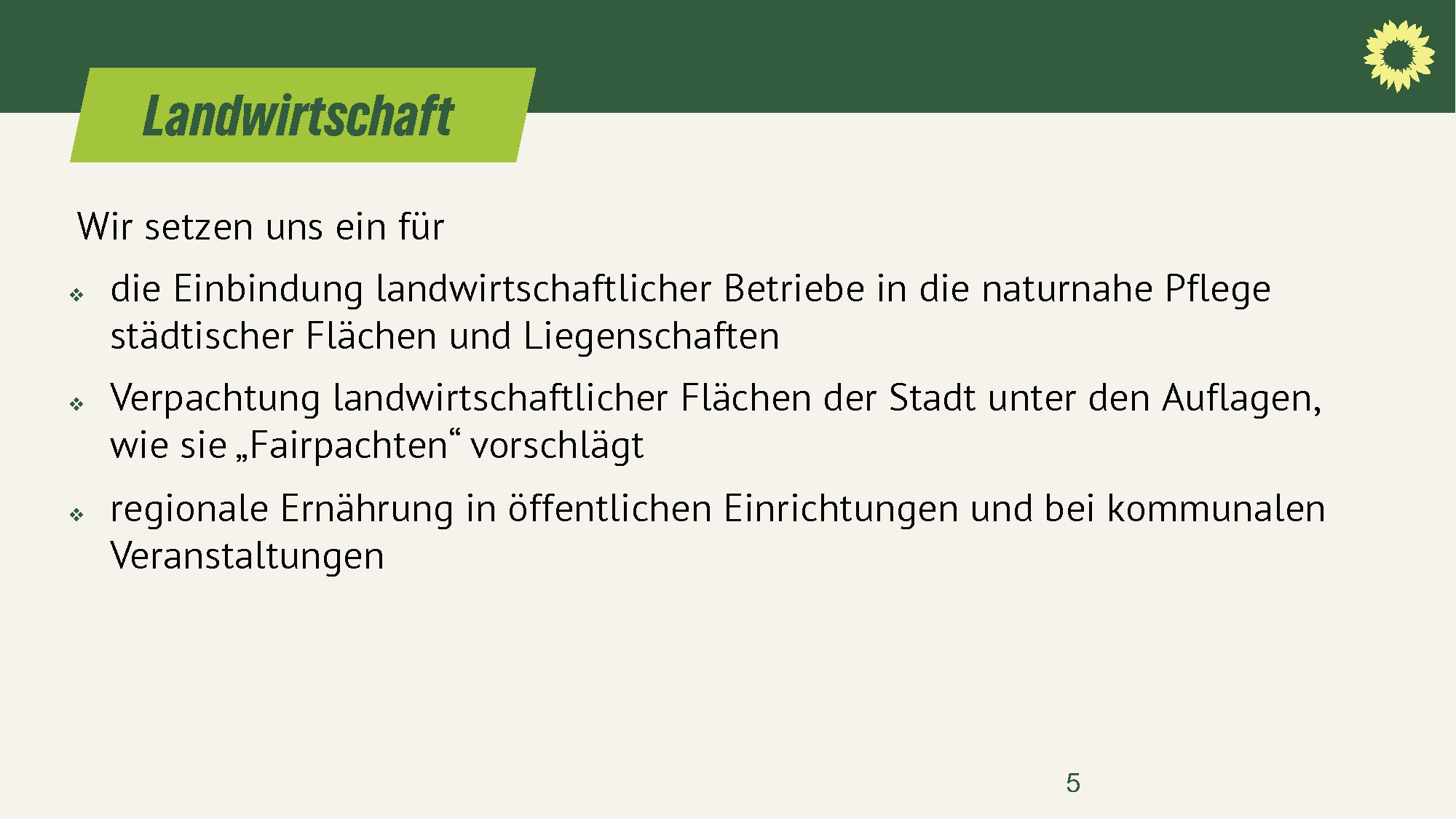 - Verpachtung landwirtschaftlicher Flächen der Stadt unter den Auflagen, wie sie „Fairpachten“ vorschlägt