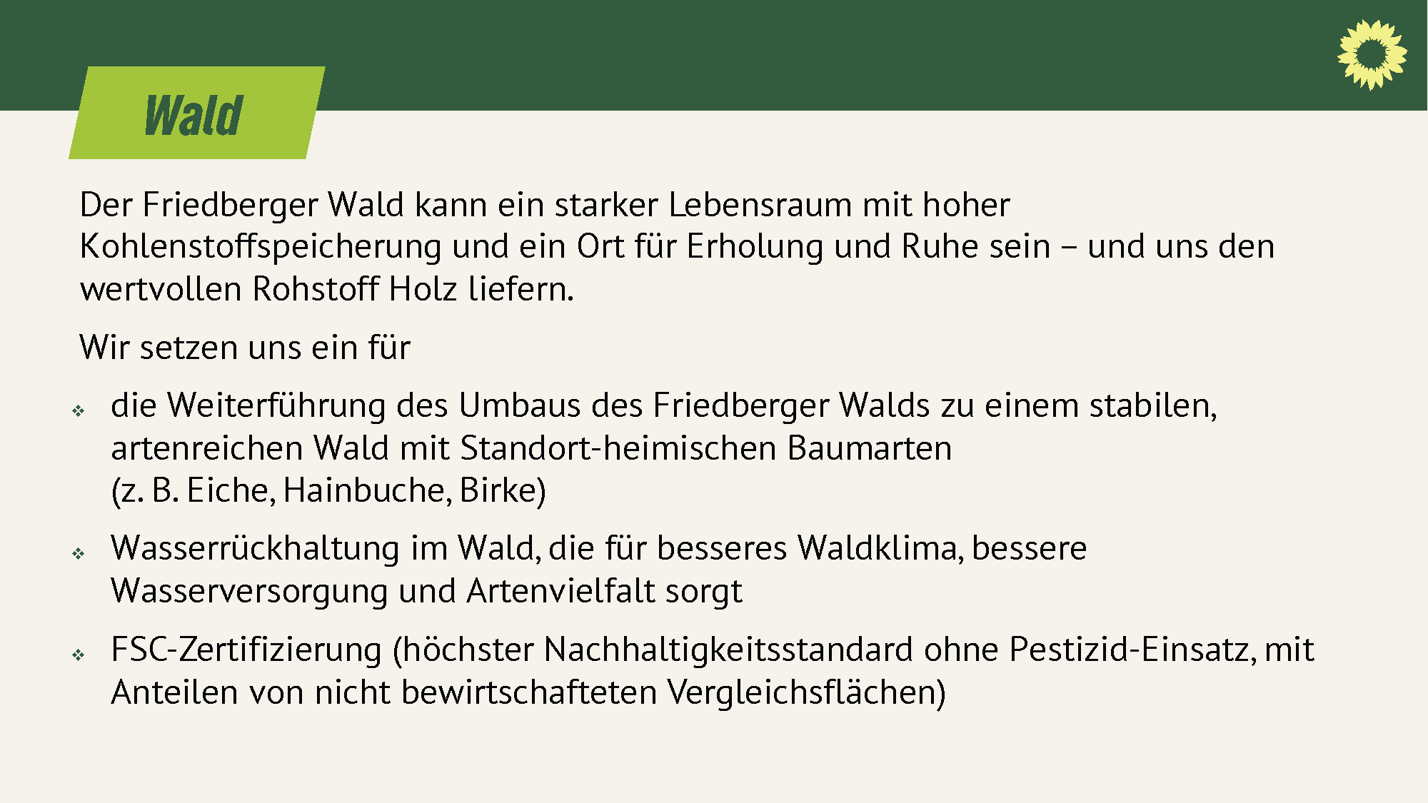 - die Weiterführung des Umbaus des Friedberger Walds zu einem stabilen, artenreichen Wald mit Standort-heimischen Baumarten (z.B. Eiche, Hainbuche, Birke)