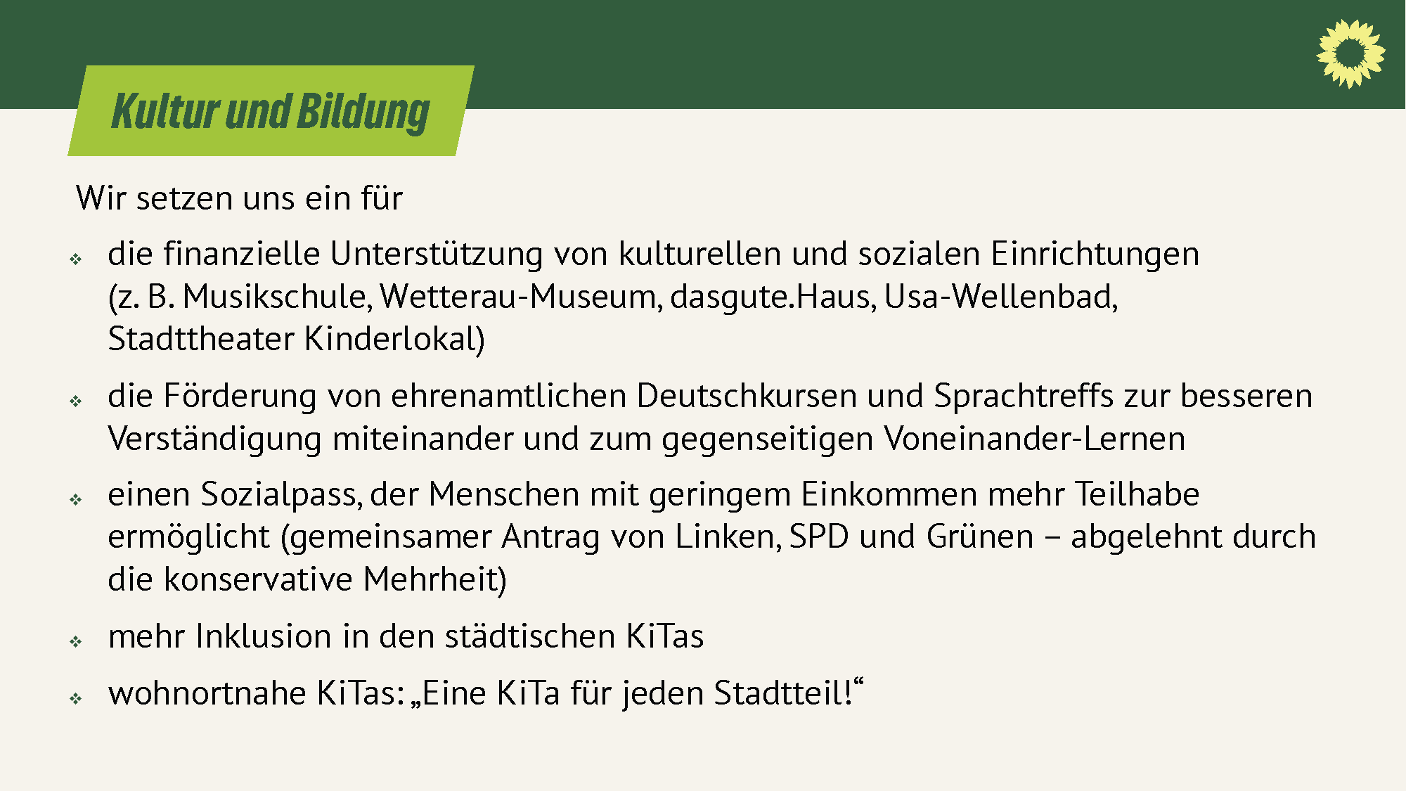 - einen Sozialpass, der Menschen mit geringem Einkommen mehr Teilhabe ermöglicht (gemeinsamer Antrag von Linken, SPD und Grünen – abgelehnt durch die konservative Mehrheit)