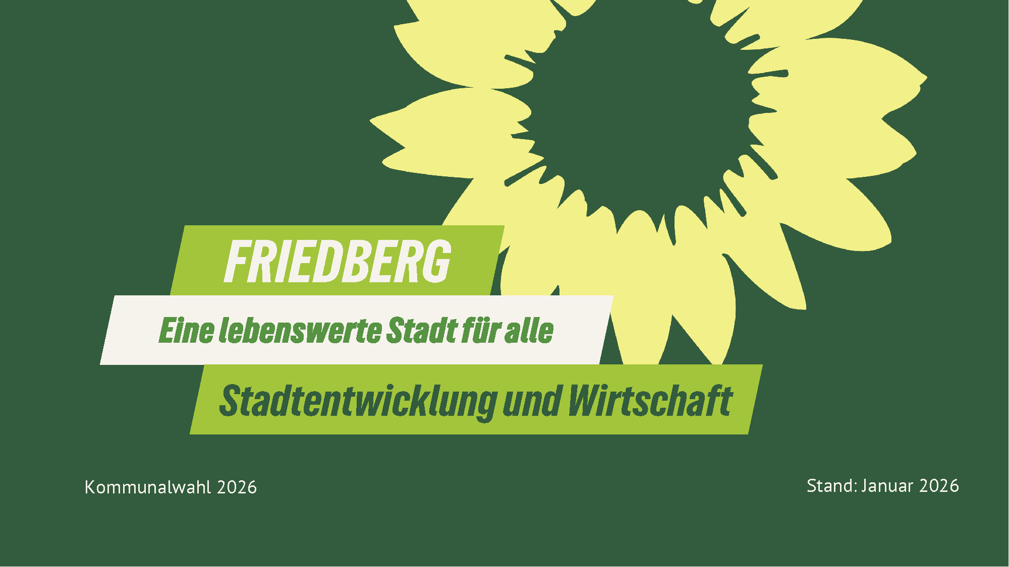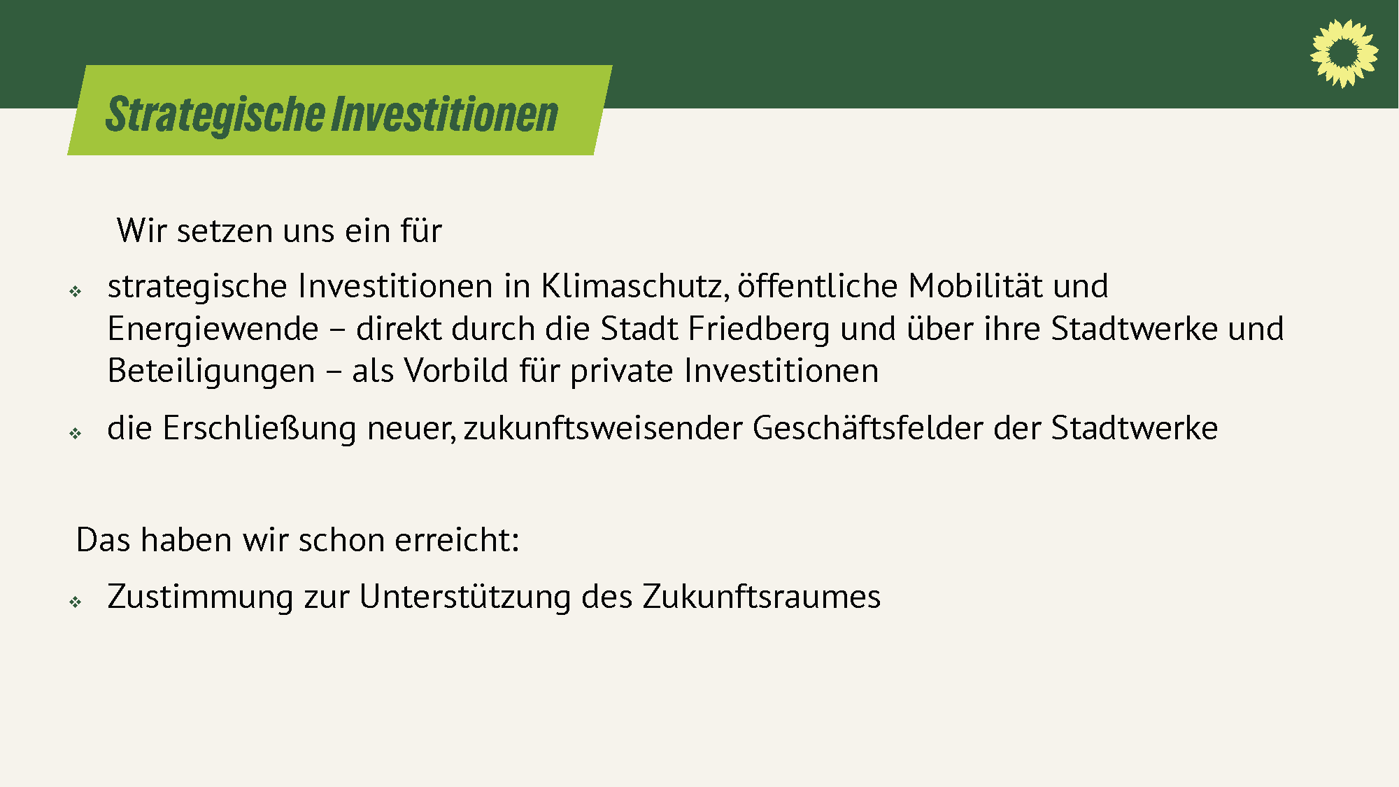 - strategische Investitionen in Klimaschutz, öffentliche Mobilität und Energiewende – direkt durch die Stadt Friedberg und über ihre Stadtwerke und Beteiligungen – als Vorbild für private Investitionen