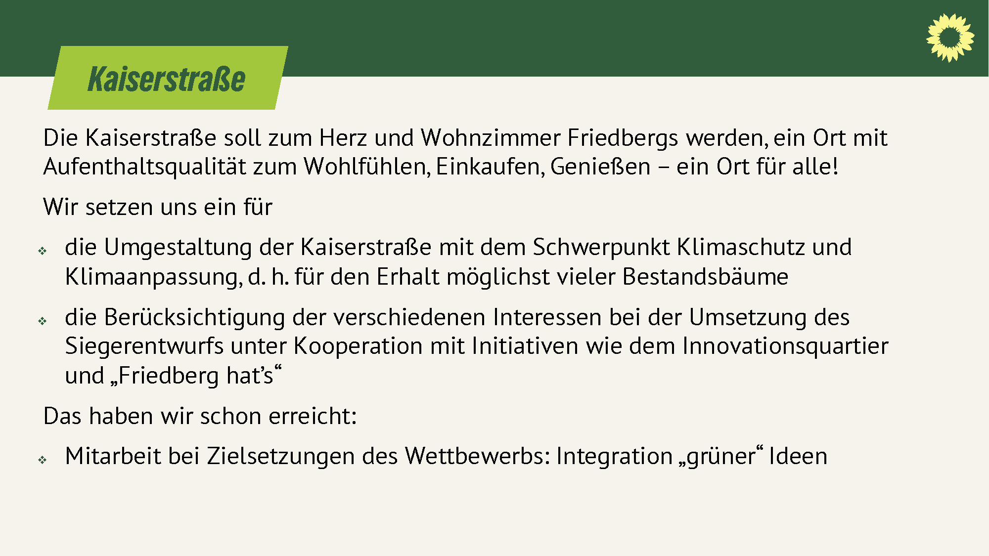 - die Umgestaltung der Kaiserstraße mit dem Schwerpunkt Klimaschutz und Klimaanpassung, d.h. für den Erhalt möglichst vieler Bestandsbäume