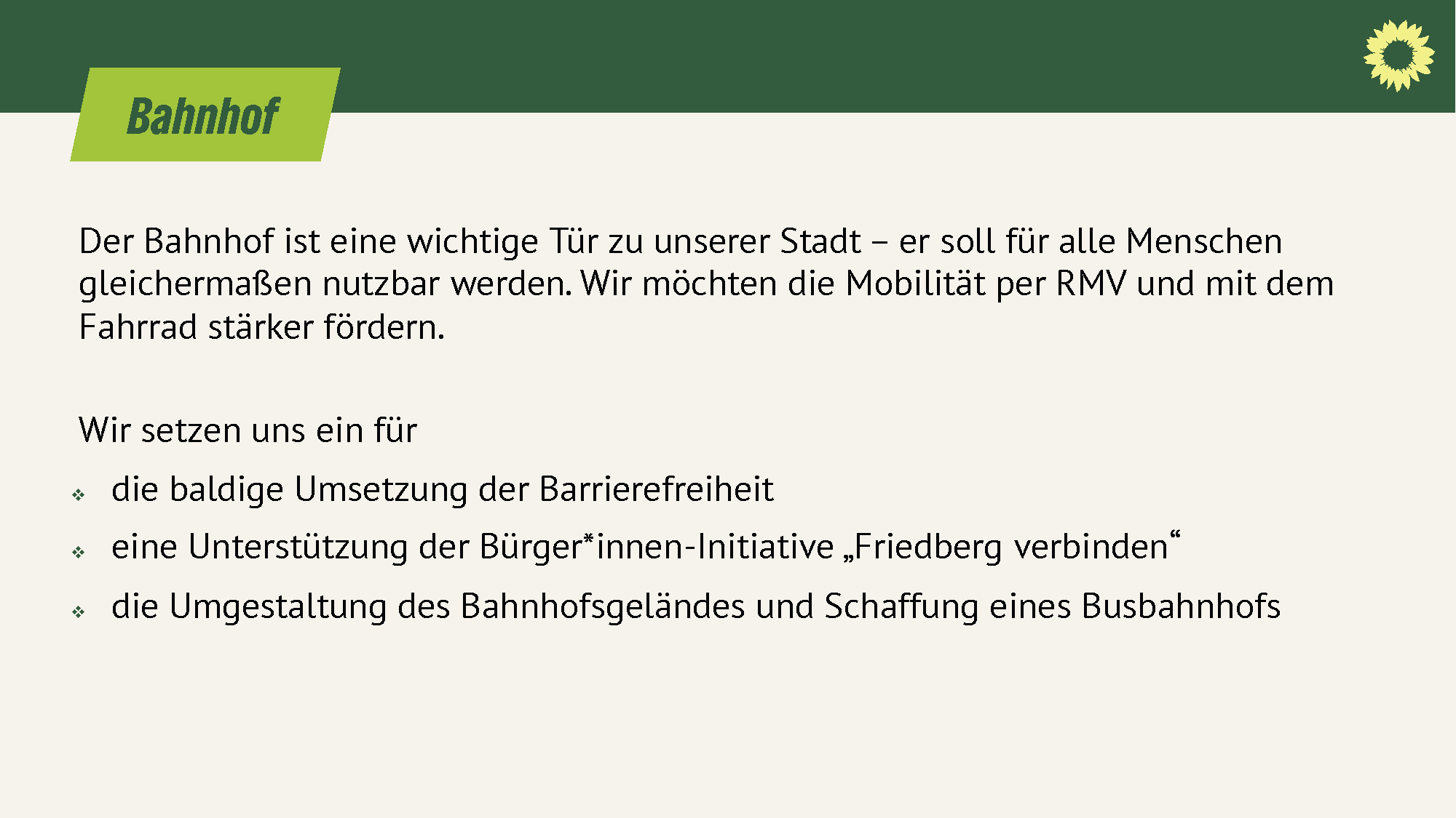 Der Bahnhof ist eine wichtige Tür zu unserer Stadt – er soll für alle Menschen gleichermaßen nutzbar werden. Wir möchten die Mobilität per RMV und mit dem Fahrrad stärker fördern.