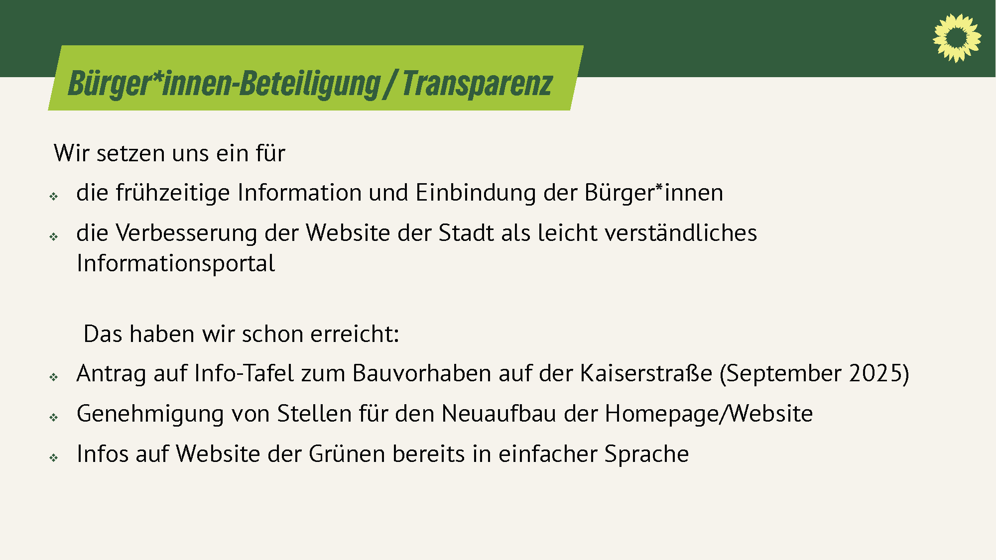 - die frühzeitige Information und Einbindung der Bürger*innen