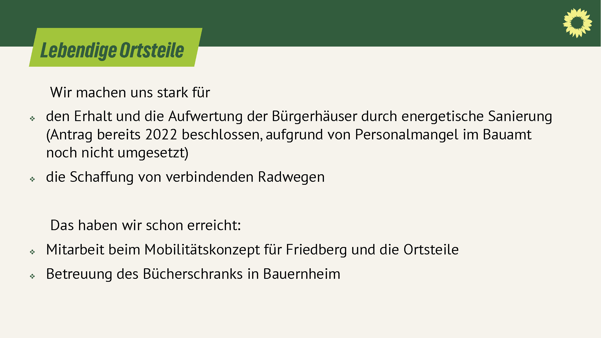- den Erhalt und die Aufwertung der Bürgerhäuser durch energetische Sanierung (Antrag 2022 bereits beschlossen, wegen Personalmangels im Bauamt noch nicht umgesetzt)