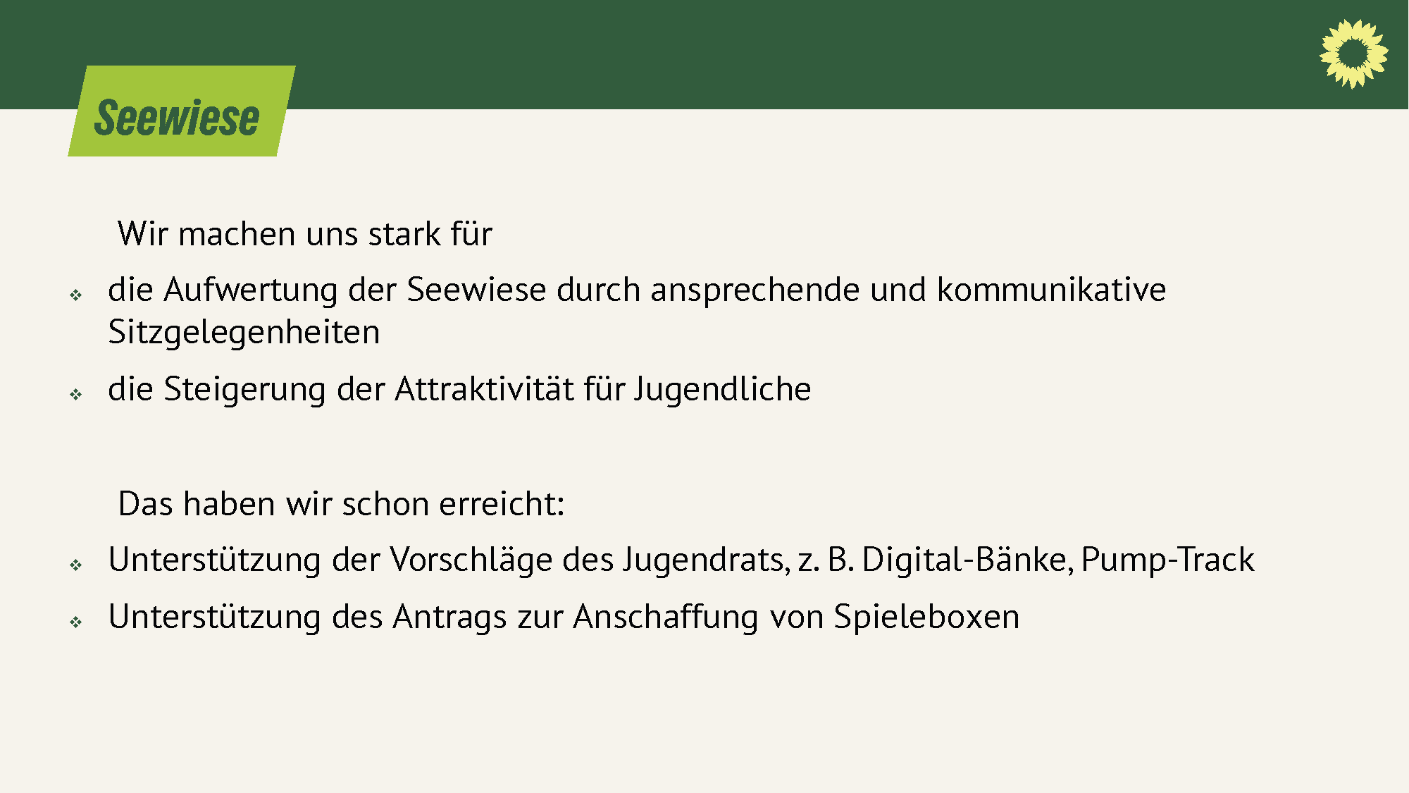 - die Aufwertung der Seewiese durch ansprechende und kommunikative Sitzgelegenheiten