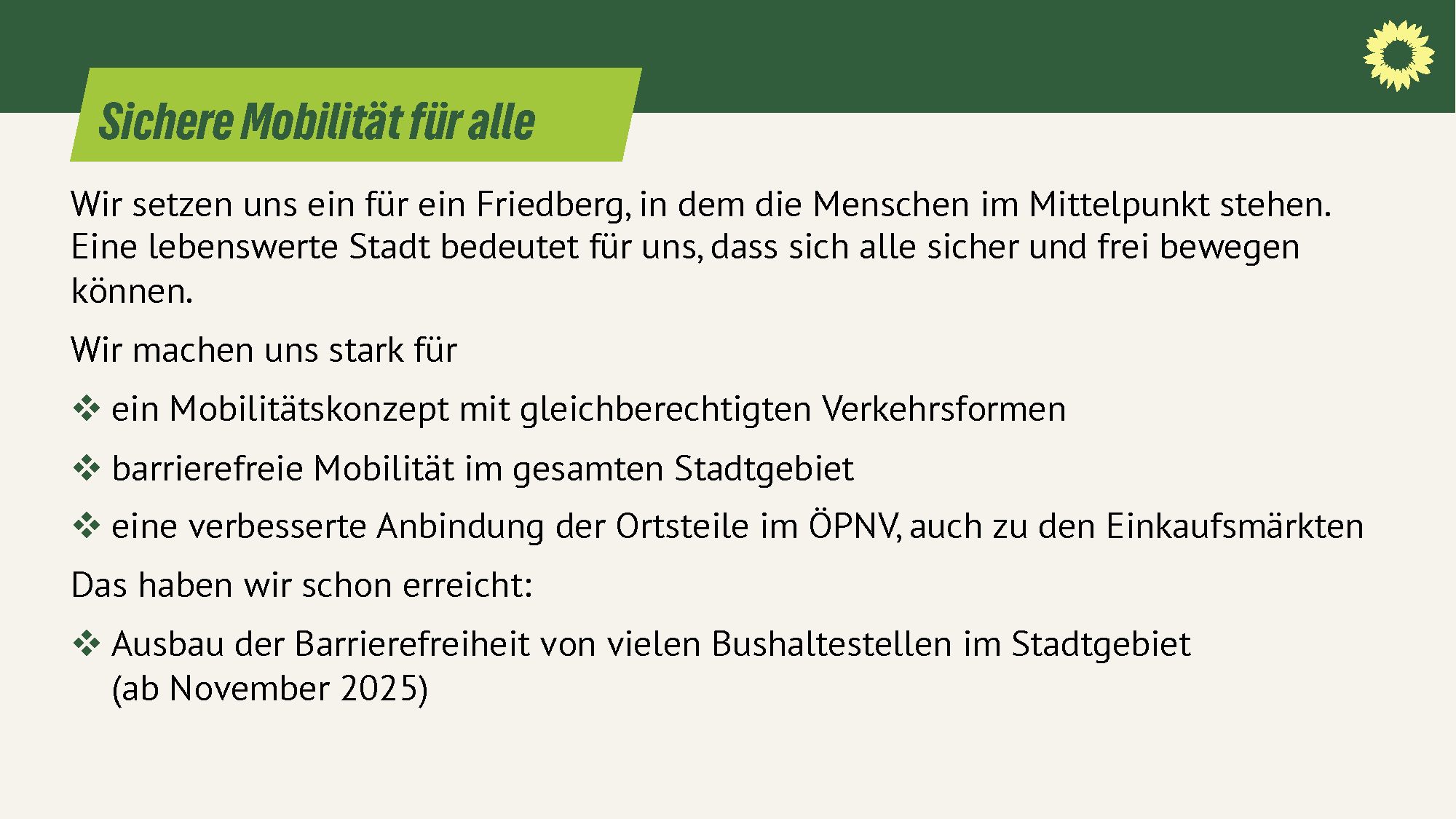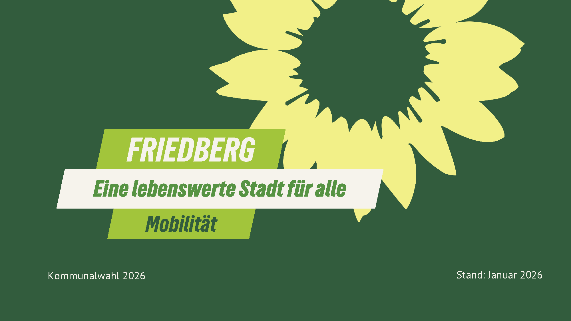 Wir setzen uns ein für ein Friedberg, in dem die Menschen im Mittelpunkt stehen. Eine lebenswerte Stadt bedeutet für uns, dass sich alle sicher und frei bewegen können.