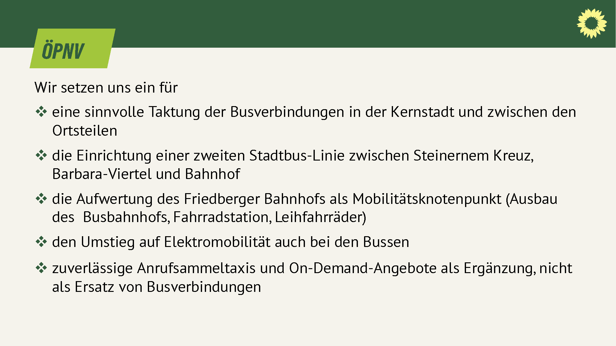 - eine sinnvolle Taktung der Busverbindungen in der Kernstadt und zwischen den Ortsteilen