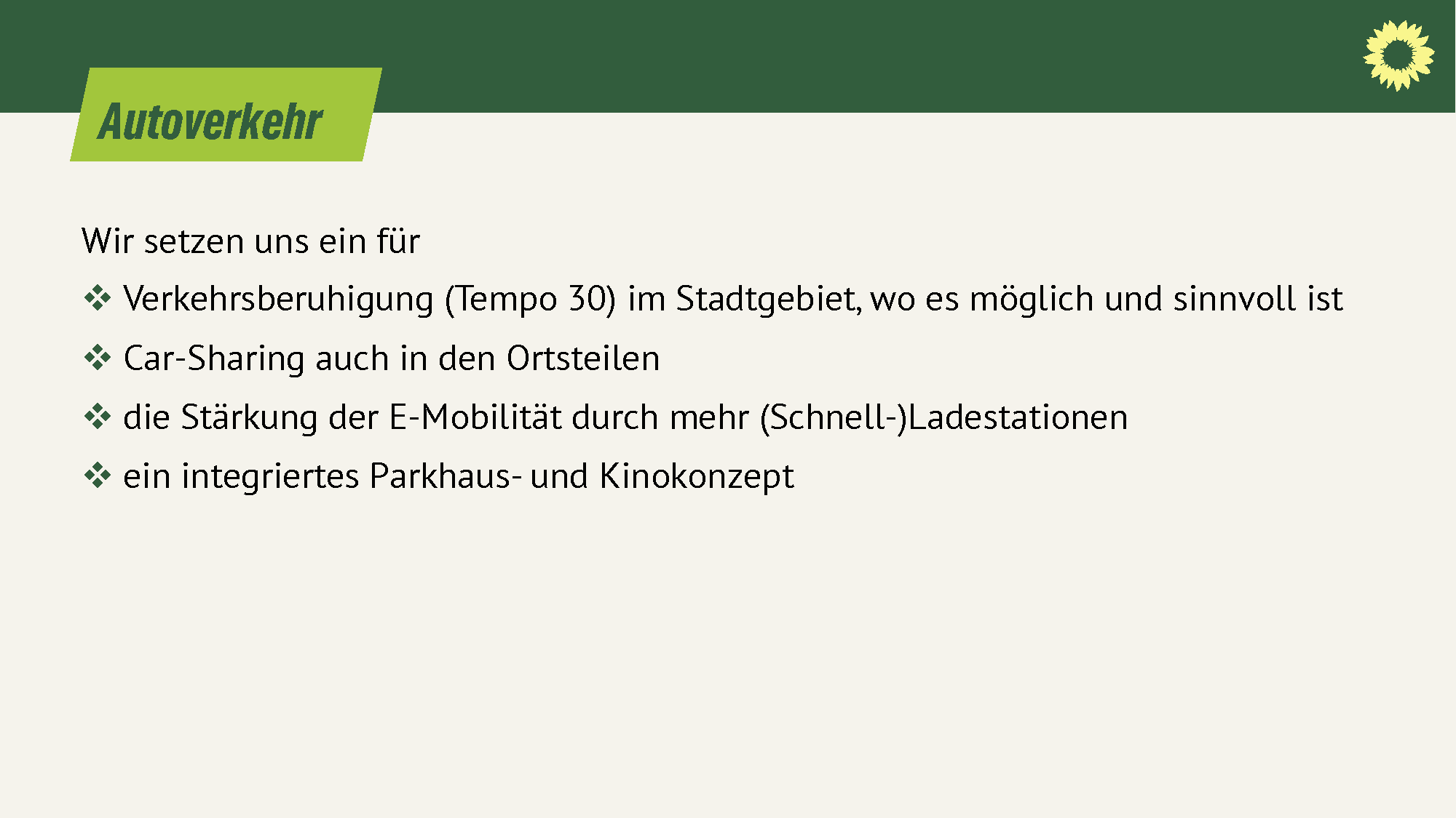- Verkehrsberuhigung (Tempo 30) im Stadtgebiet, wo es möglich und sinnvoll ist